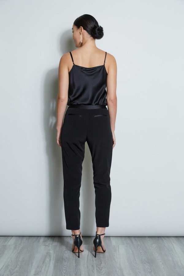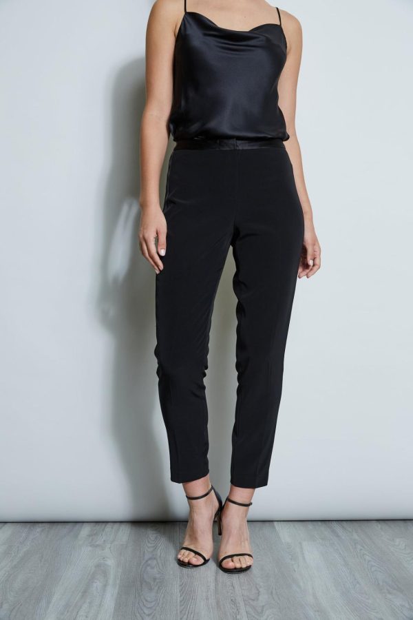 We chose our favorite Satin Back Crepe for the season’s must have tuxedo pant. Incredibly flattering with a slim leg – these pants feature a satin waistband and satin track stripe down the side – get ready for the compliments.