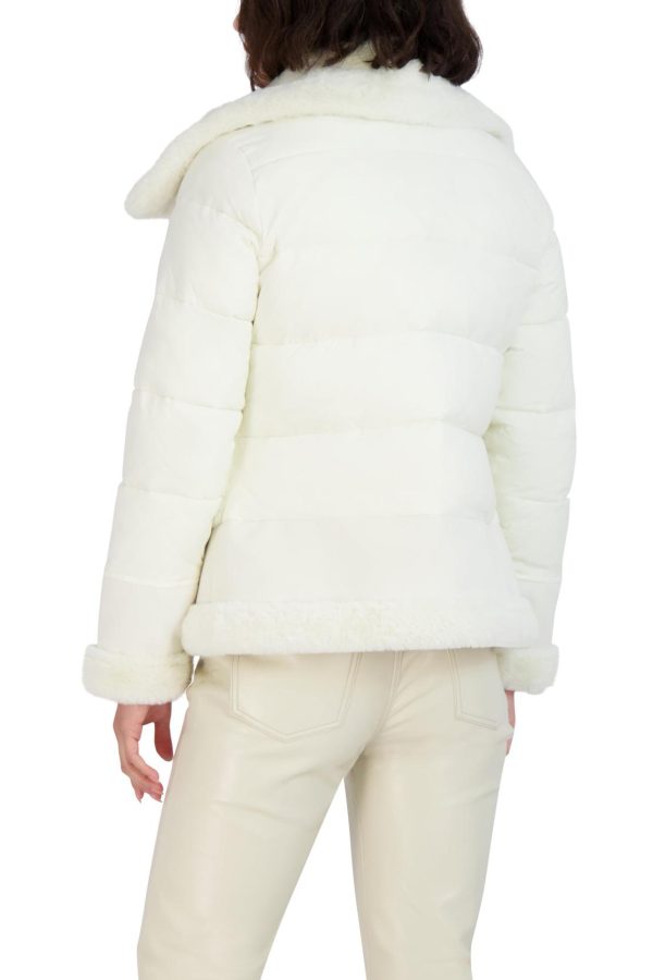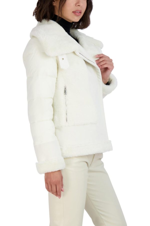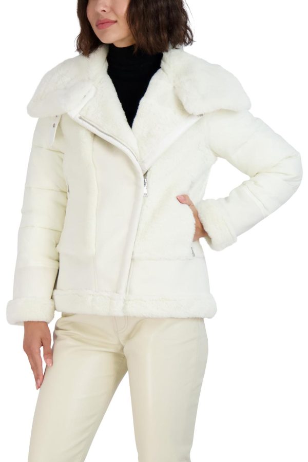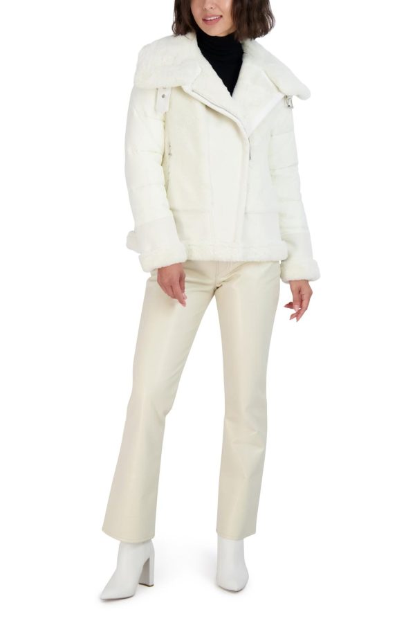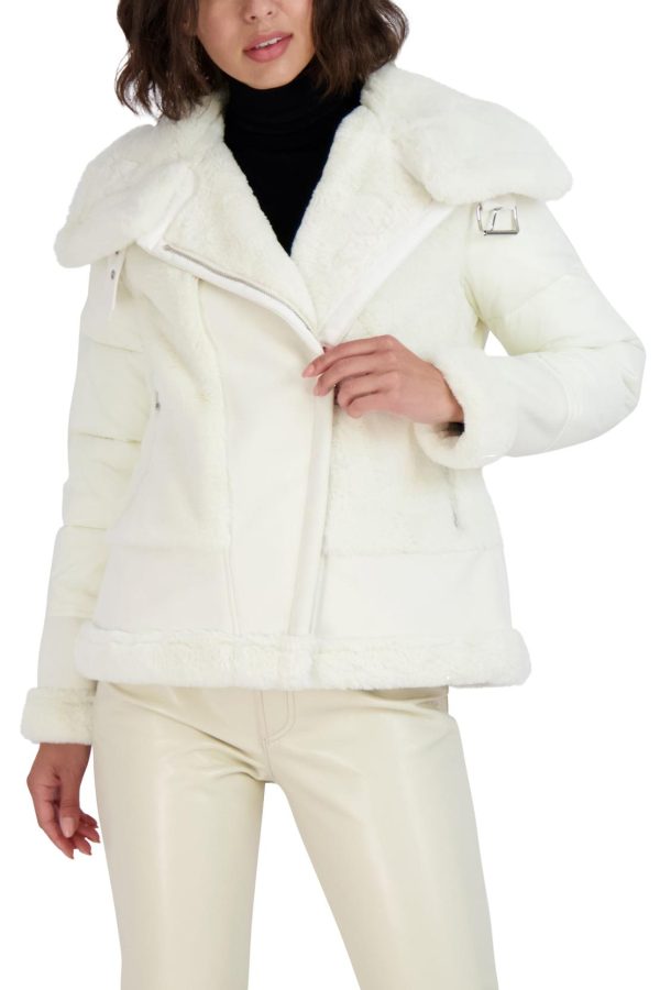 Tahari’s mixed-media Coat is designed with luxe faux fur & puffer sleeves. The asymmetrical zip silhouette & faux leather trim make this chic coat a must-have.