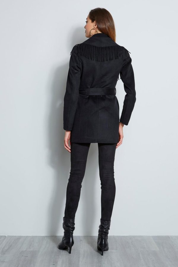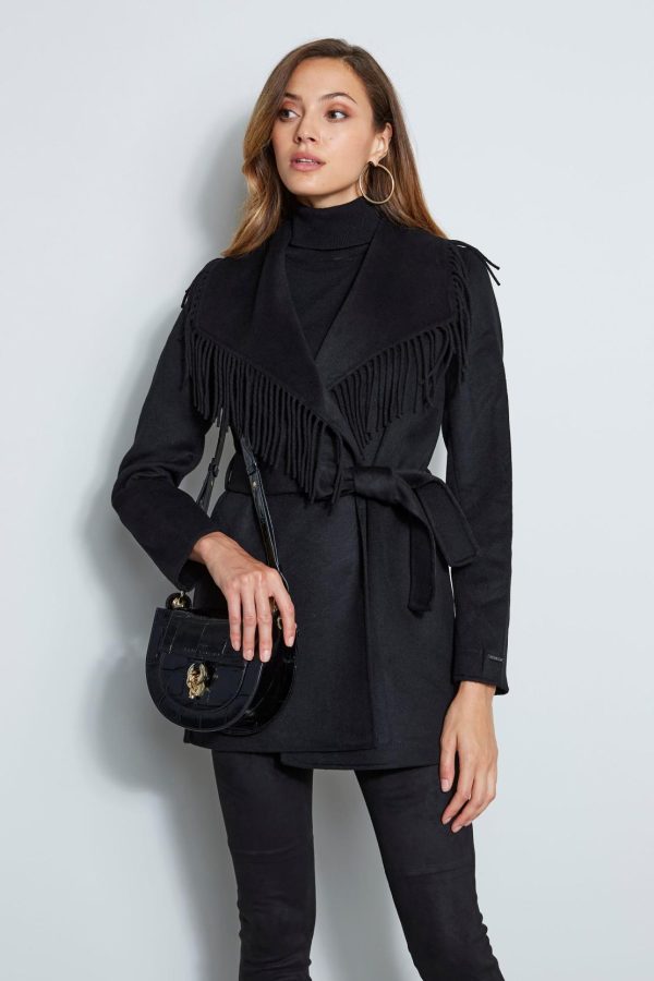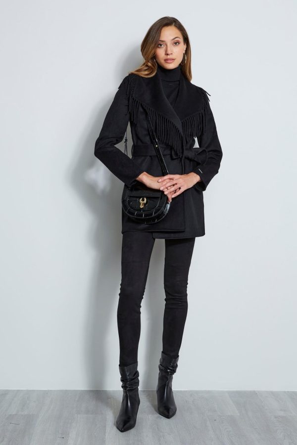 Get cozy in this sophisticated wrap coat in a Luxe Wool blend. Fringe trim borders the dramatic shawl collar & wrap front. Wear it with or without its matching sash to envelope you all season long.