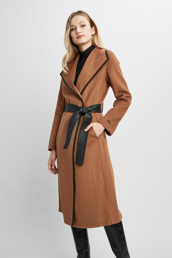 - Tahari Long Wool Wrap Coat with Faux Leather Trim & Sash