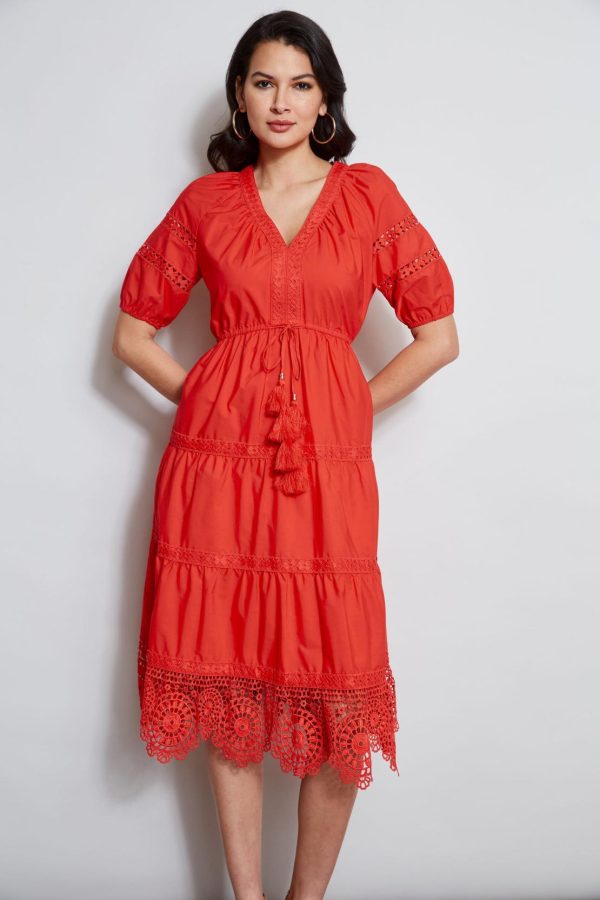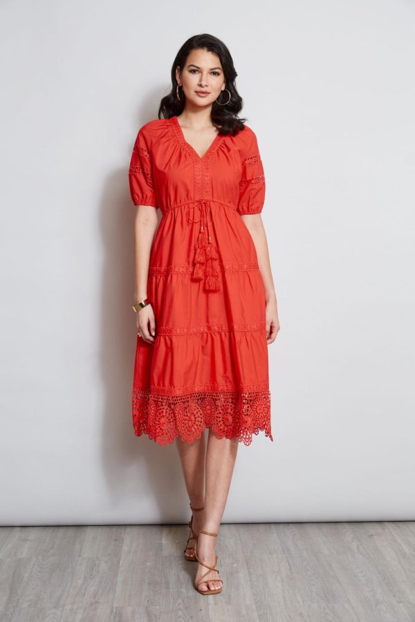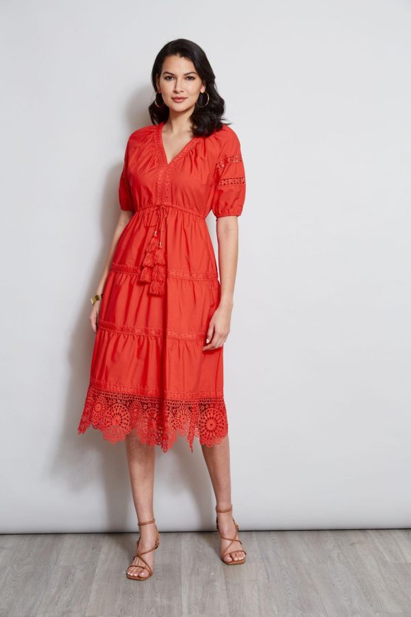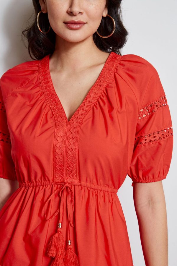 Elie’s favorite stretch Cotton Blend has the Luxe Patina and comfort he wanted for the seasons must have shirtdress. The unique cut-out embroidery at the hem & sleeve, soft full skirt and tassel time at the waist speak designer.