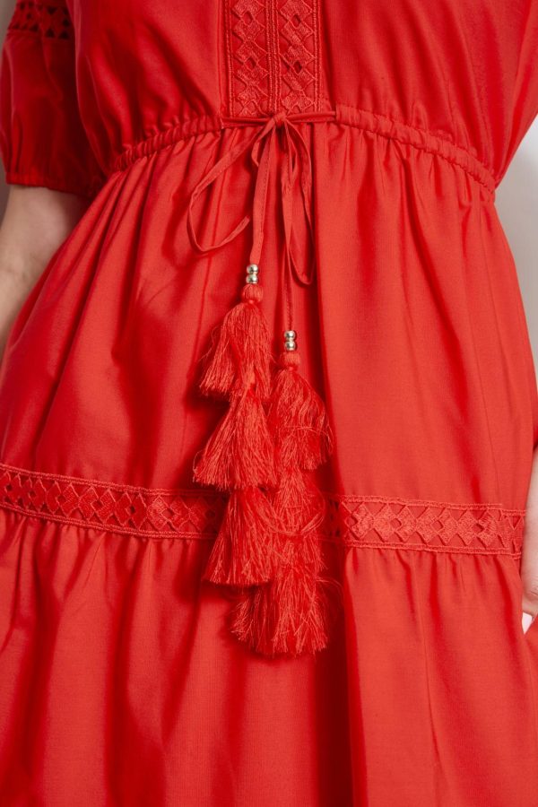 - Cotton Blend Short embroidered sleeve Tie Front Dress
