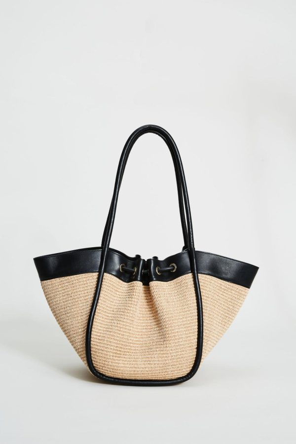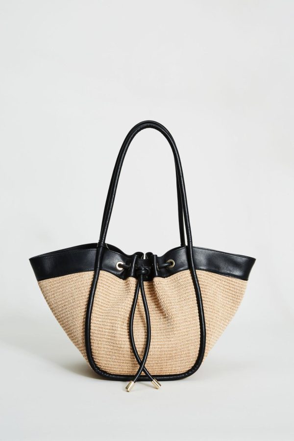 - Raffia & Italian Leather Tote Bag with Gold Stud accents & a drawstring Knot Closure