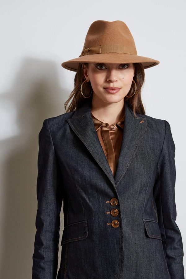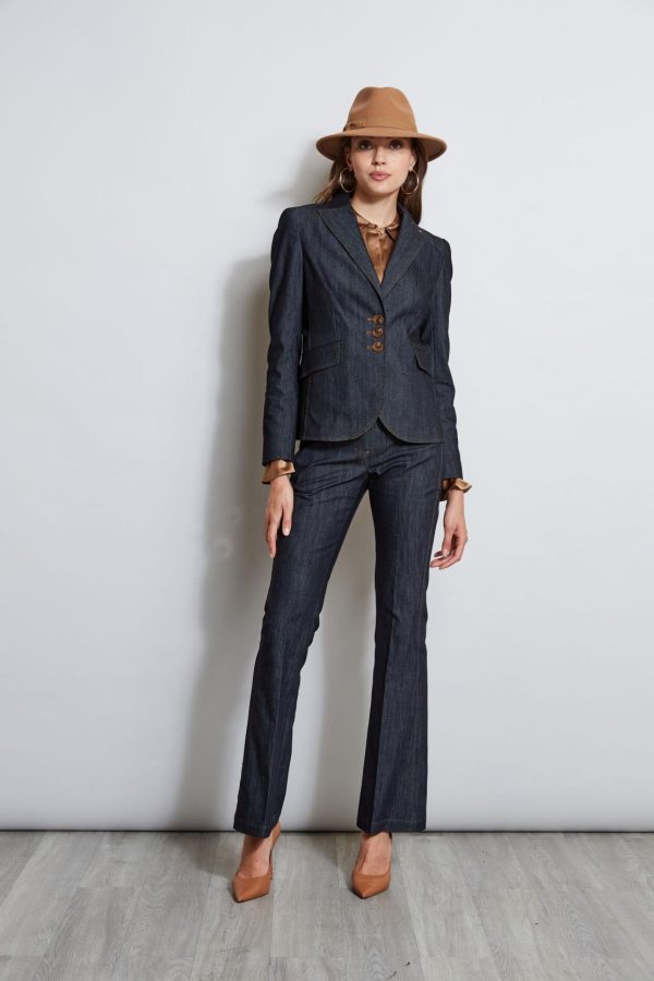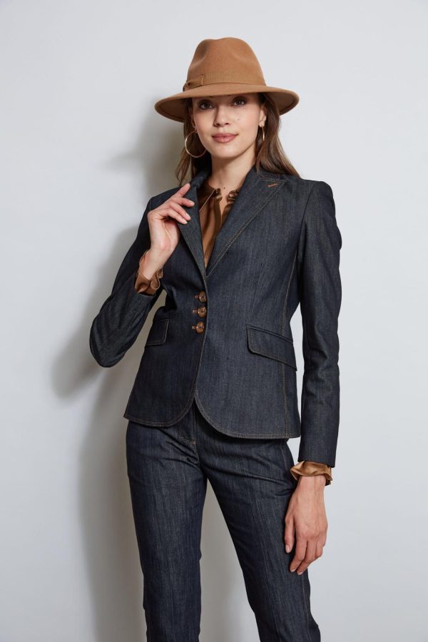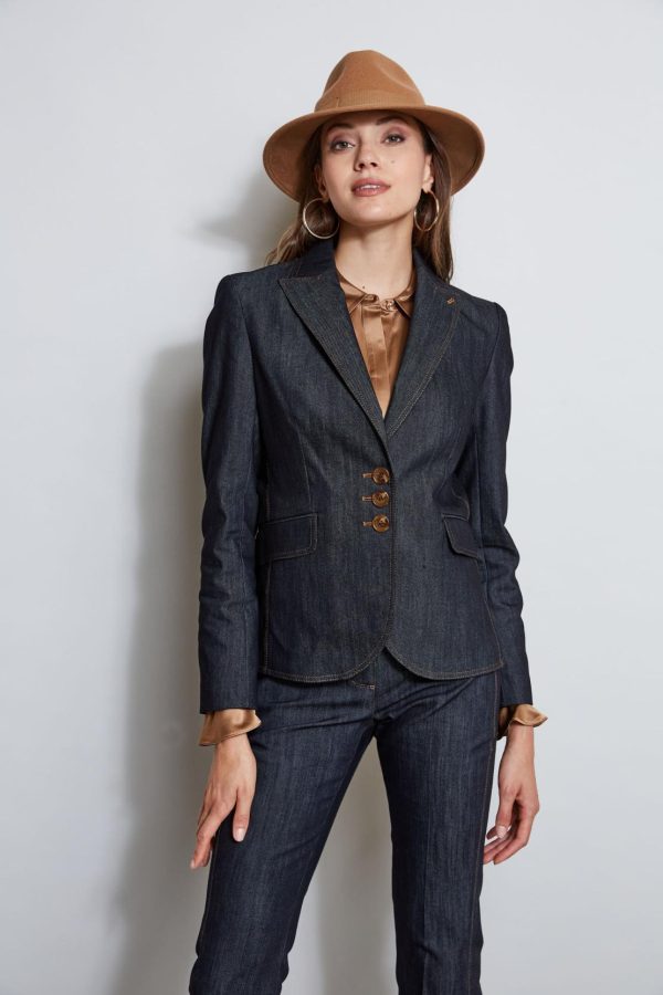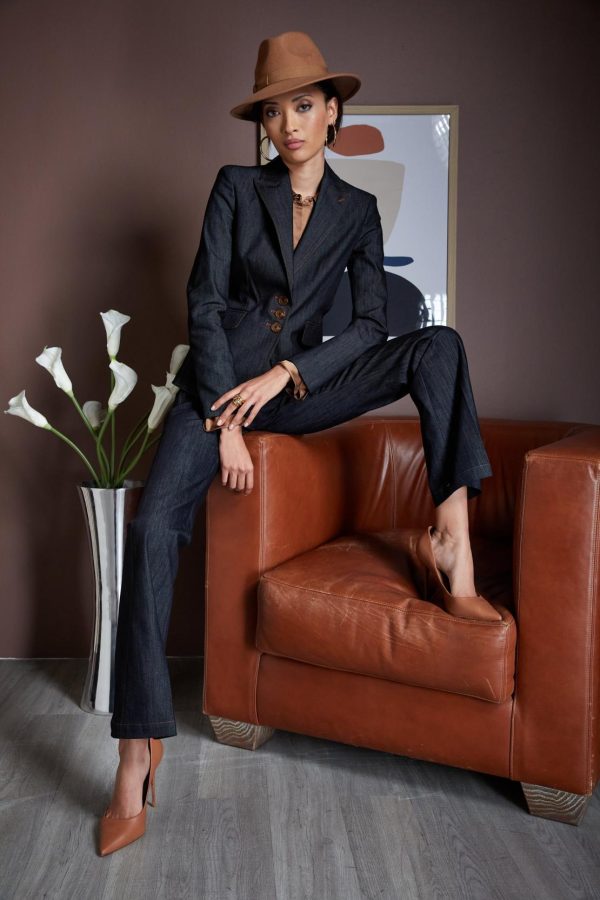 With modern lean lines and sharp tailoring, the denim blazer is an essential in your fall wardrobe rotation. Done in luxe stretch denim, single breasted with peaked lapels, contrast caramel stitching and an impeccable cut, it has the cool factor you are looking for in your new favorite blazer. Pair it with its matching pant or wear it as a separate.