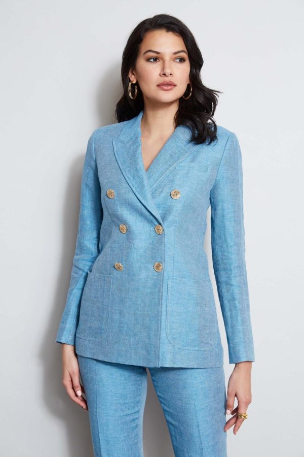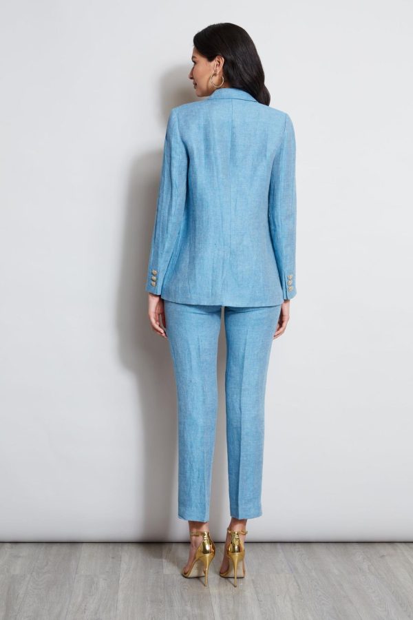 Elie chose a sophisticated Linen melange for his signature Double Breasted Jacket. The sporty chic attitude of our double-breasted jacket gives it the versatility you are looking for, while the standout gold buttons make it special. Pair it with its matching slim leg linen pant, crepe or denim.