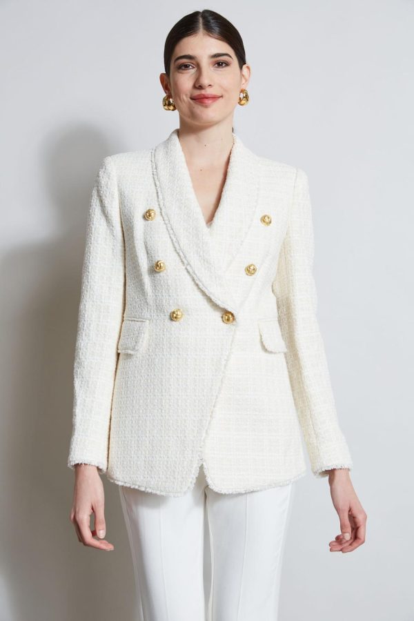 Elie chose a sophisticated Italian Tweed for his signature Double Breasted Jacket. The shawl collar & pockets are edged in self fringe and standout gold buttons detail the closure. Pair it with our signature leggings, crepe or denim pants.