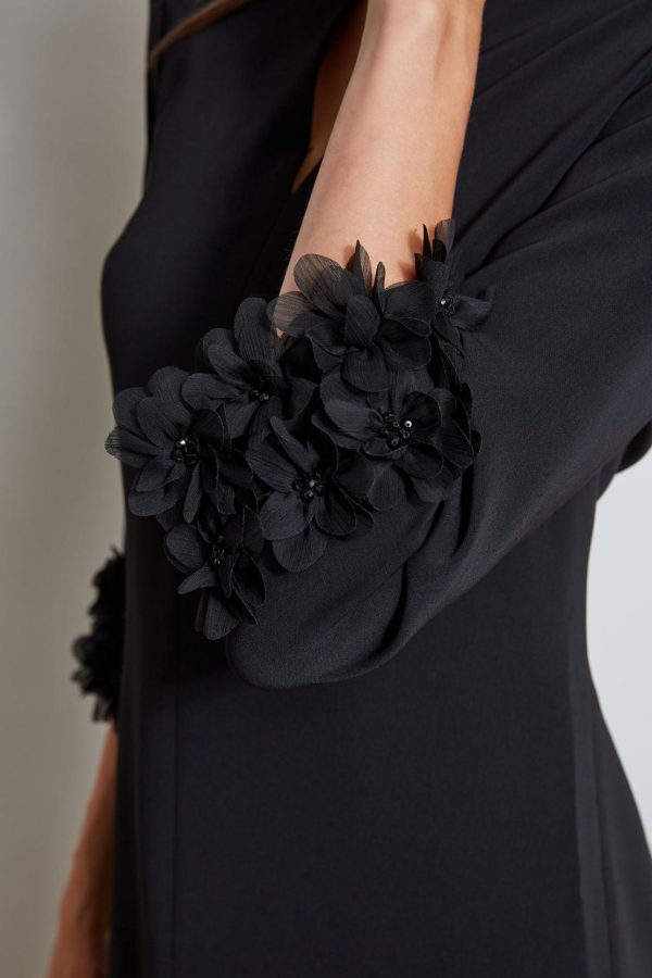 You will fall in love with his playfully chic cocktail dress. The easy shift silhouette has a keyhole neckline and three-quarter sleeves accented in laser cut crinkle chiffon flowers with hand beaded centers. It ‘s perfect for dinner and wherever your night takes you.