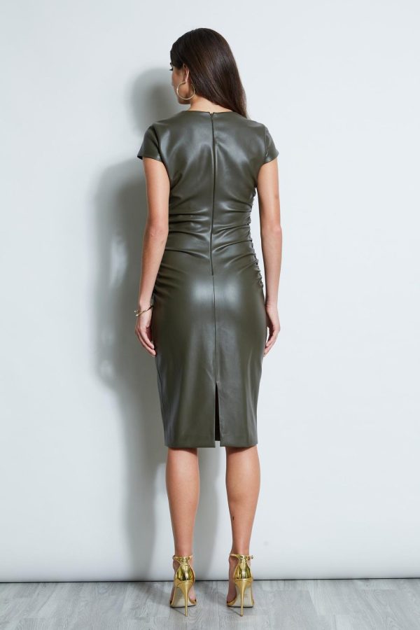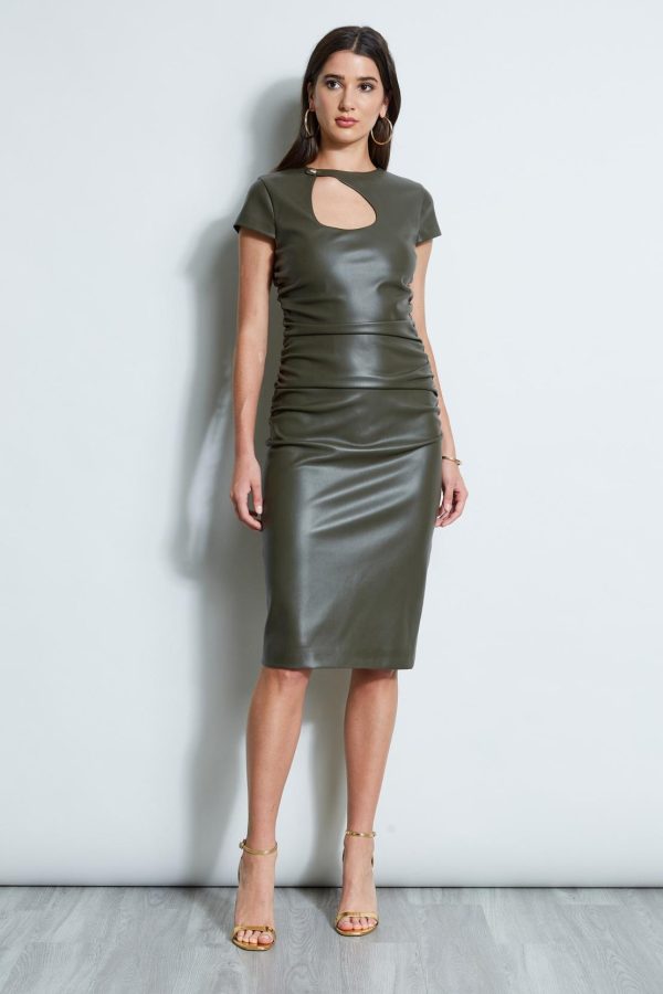 Modern architecture was the inspiration for our sleek Vegan Leather body skimming dress. All eyes are on the keyhole cutout that is accented with a sleek metal button. Embrace your curves with confidence, as this dress features flattering side ruching that creates a stunning fit. This dress has the designer edge that you have been looking for.