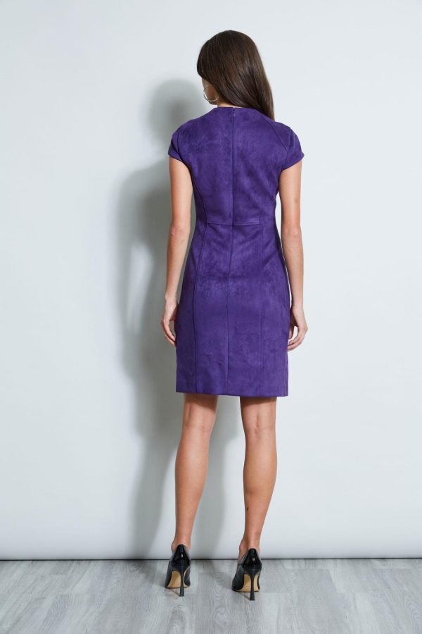Our chic Vegan Suede Dart Dress will become your favorite go-to piece. Luxe Soft Touch Vegan Suede delivers this body skimming silhouette with its sculptured dart neckline & cap sleeve- perfect for desk to dinner.