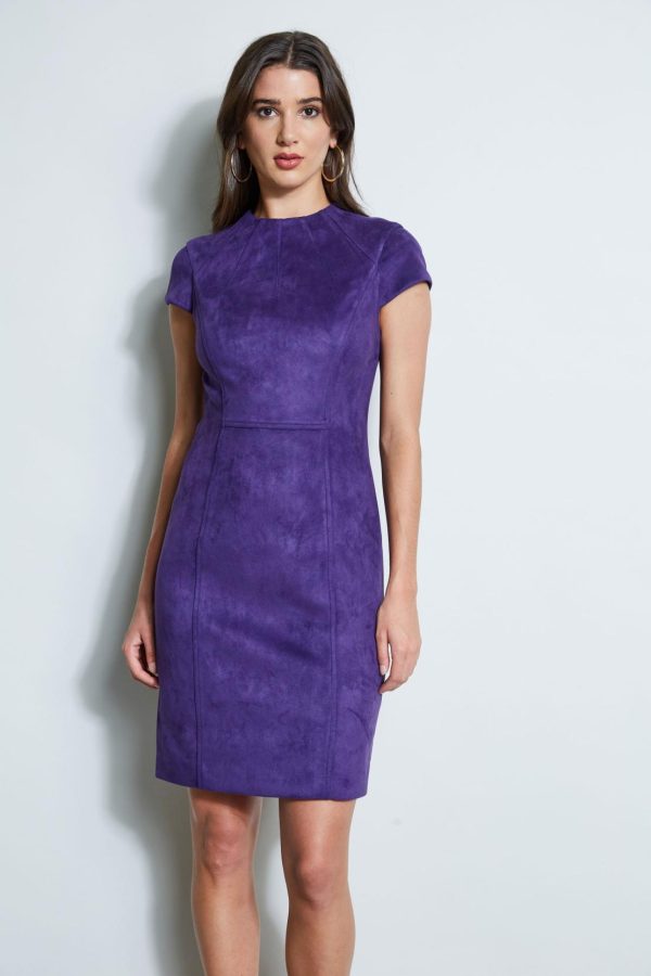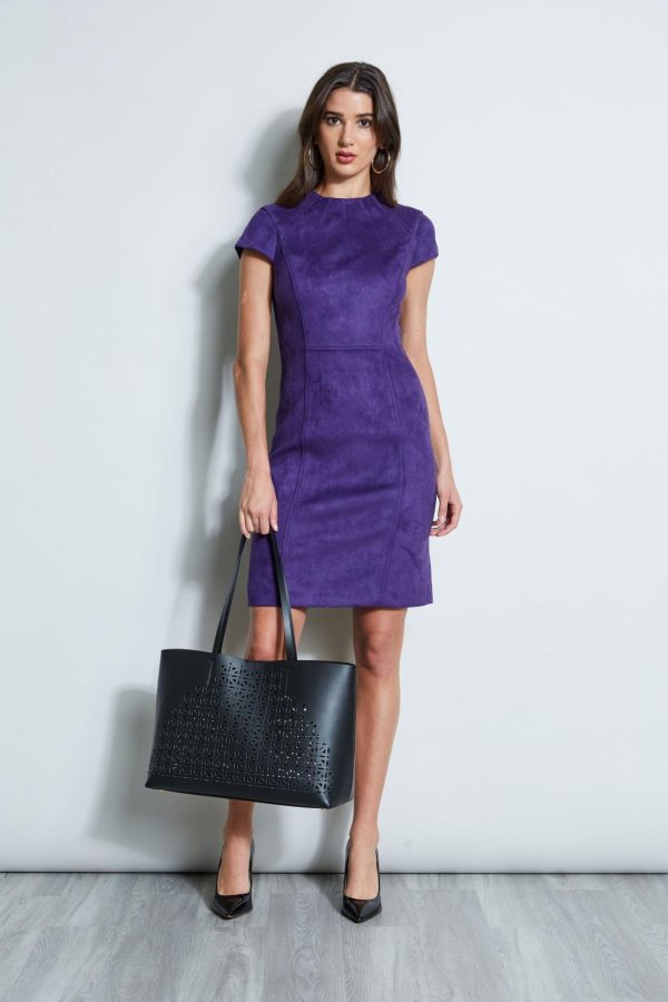 - Vegan Suede Dress with Mock Neck Dart Detailing and Fit & Flare Silhouette