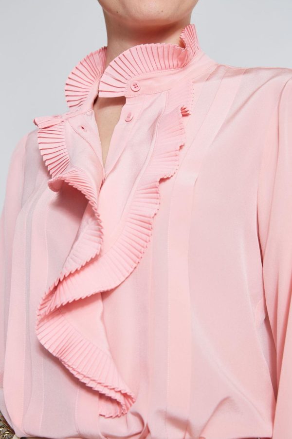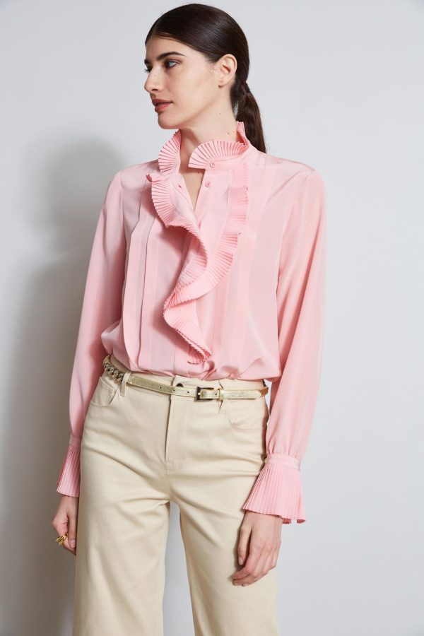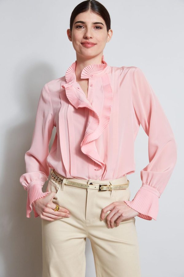 Every wardrobe needs a chic Silk top. Upgrade yours with a charming cascade pleated ruffle effect in luxe silk georgette. It adds the right touch of femininity to this must-have long sleeve blouse.