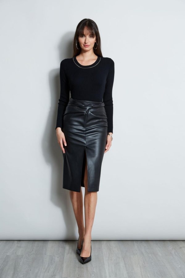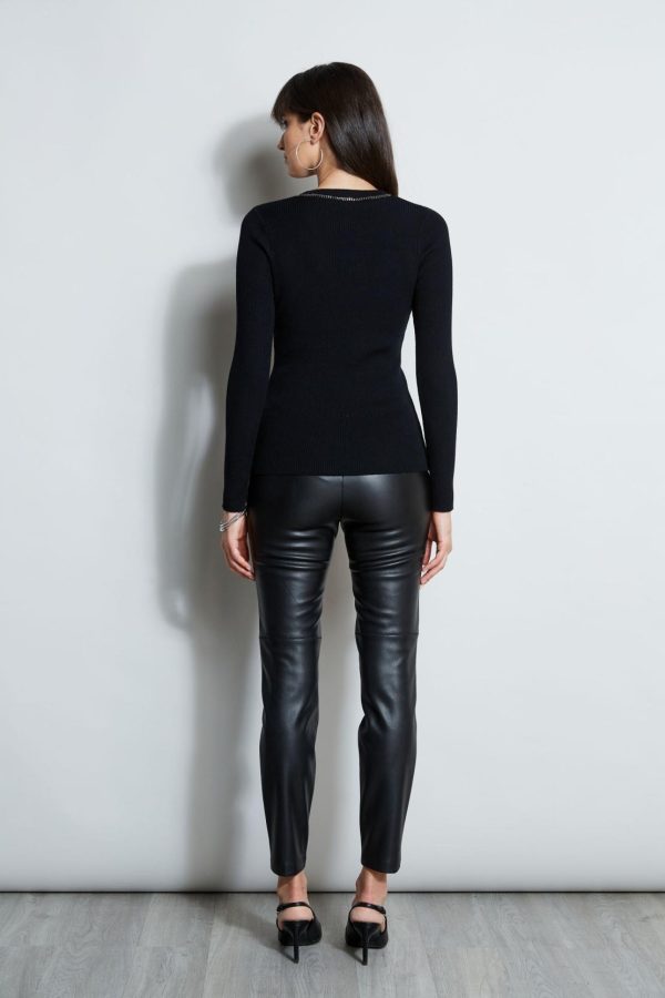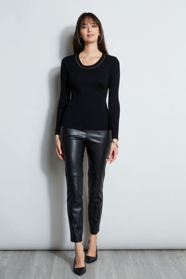 A sweater with a designer attitude, chain details the scoop neckline of our modern body skimming rib sweater. Designed in luxe Merino, it ‘s a sporty chic addition to your Fall closet.