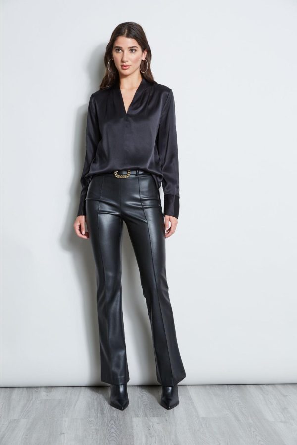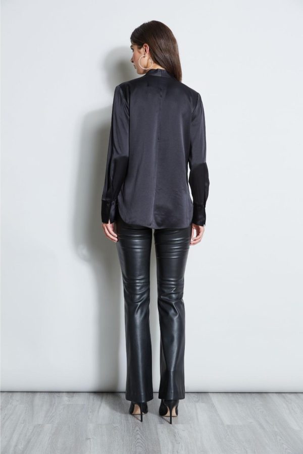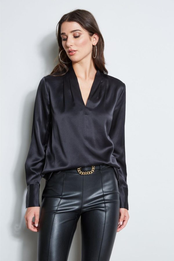 Effortlessly chic, this shirt is destined to become a favorite. Luxurious Silk Satin elevates this minimalist long sleeve top. With its contour neckline and soft pleat detail, this essential piece works throughout the seasons.