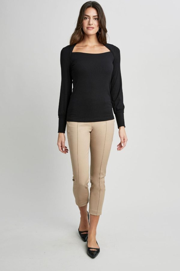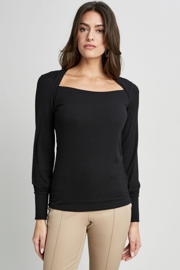- Straight Neck Ribbed Knit Top with Blouson Sleeves